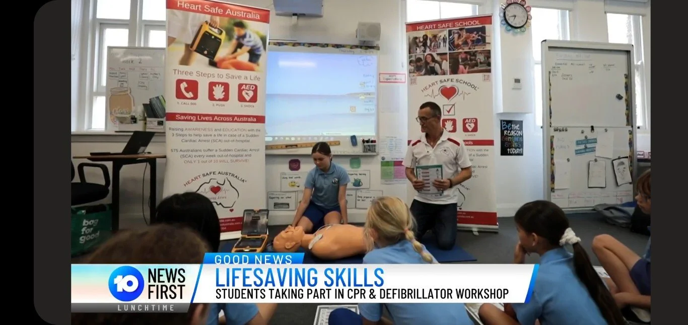 Heart Safe School Lifesaving Program for kids at St-Mary Catholic Primary School in Manly captured by Channel 10 Good News during Heart Week.